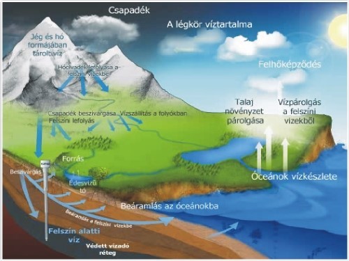 A víz körforgását hidrológiai ciklusnak nevezzük, melynek kezdeti fázisa a párolgás. A felszíni vizeink és az élőlények folyamatosan párologtatnak, a pára felemelkedésével felhők keletkeznek. A felhőkből csapadék képződik, mely lehet szilárd és folyékony halmazállapotú.