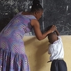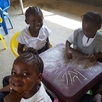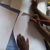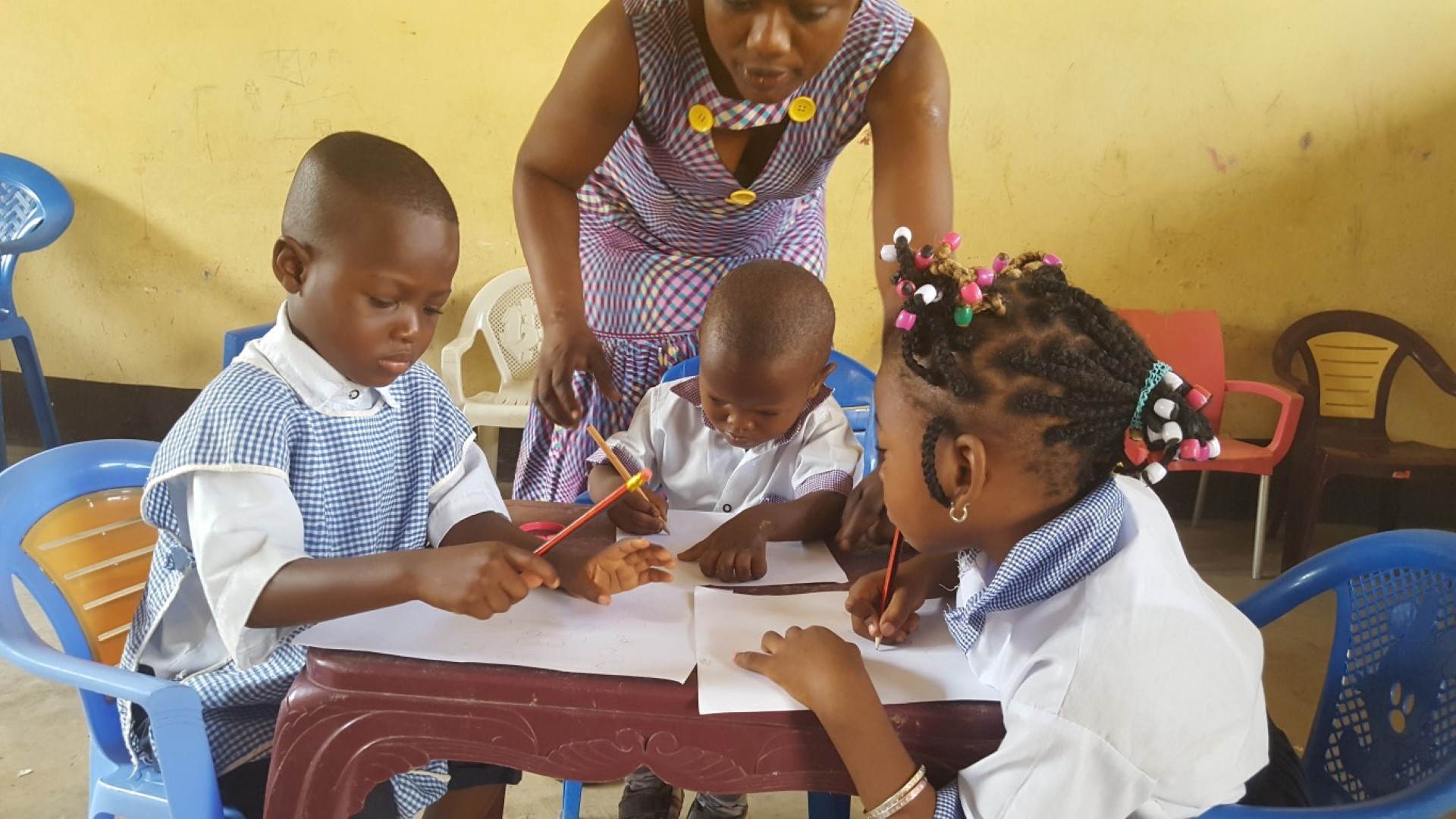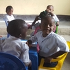 Miután a gyerekek végeztek a rajzolással, kis nevük felkerült a papírra: „Je m’ appelle Chancel, Je m’appelle Alicia.” hogy Youyou összegyűjthesse azokat. Már ez a kis feladat is segít abban, hogy a gyerekek megszokják, az iskolában az otthon használatos lingala helyett a franciát kell használniuk majd.