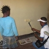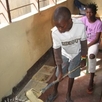 A munkában akadtak segítségeim: a gyerekek. A gyerekek sokszor figyelik, amit csinálok. Mindig akad valaki, aki utánam jön az irodába is, figyel. Így volt ez ma is. Sarah jött és beállt segíteni. Komolyan mondom erősebb a kislány, mint én. Pakolta arrébb a padokat (ami együtt van az ülőkéjével), hogy tudjak könnyebben söprögetni. Utána meg alig tudtam elküldeni enni, annyira akart festeni is. A másik nagy segítségem Rigean volt. Ő nagyon beteg volt az elmúlt hetekben, volt olyan, hogy az egész árvaház nem aludt éjszakákon át, mert ő annyira sírt a fájdalomtól. És ne egy elkényeztetett, gyenge fiút képzeljetek el! Sajnos még tegnap is fájt a bokája és a csuklója, még nincs teljesen jól. Viszont ha történik valami, akkor az utolsó erejét is összeszedi, hogy mosolyogjon, hogy ő is benne legyen. Hála Istennek, ma már nem utolsó erejét összeszedve akart dolgozni, már sokkal jobban van, de a betegség miatt nagyon-nagyon lefogyott, vékonyabb a felkarja, mint a csuklóm! Nincs étvágya még mindig, mindennap úgy kell beleerőltetni az ennivalót. Szóval ma ő volt másik nagy festő. Nagyon precízen, szépen, rendezetten dolgozott, mintha évek óta azt csinálná. Megosztottuk a munkát: amikor ott voltak, én csináltam a fal nagy részét felül, alul pedig ők. Voltak még néhányan, akik benéztek, ők a cseppek feltakarításában segítettek. A munka eléggé elhúzódott, de nagyon élveztük!