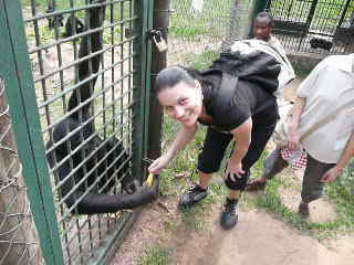 A délutánt a Bonobo (kizárólag a Kongó-medencében élő majomfaj) parkban töltöttük, ahol az orvvadászoktól vagy a kereskedőktől megmenekített majmokat gondozzák az élőhelyüknek megfelelő környezetben, és idővel visszatelepítik őket a vadonba. A park hamisítatlan esőerdő - hangulatában élvezhettük a kongói tartózkodásunk első napsugarait – az időjárás többnyire meleg, párás, felhős égbolttal. Vidám perceket töltöttünk együtt a bohókás „kollégákkal” – igazoltan a génállományunk 98,6%-ban megegyezik: egyikük beült egy vízzel teli betonkádba, mintha épp pezsgőfürdőt venne, a másik pofákat vágott, a harmadik a hasát vakartatta, majd viszonozva a kedvességet, ő is megvakarta a turista kezét. A bonobókat nem kellett sokat kérlelni, hogy engedjenek a banán csábításának, amit út közben vásároltunk a helyiektől friss ananásszal és avokádóval együtt.